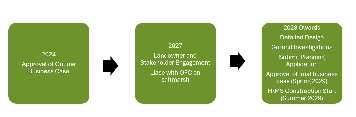 The appraisal of Flood Risk Management Schemes requires a phased approach. The Environment Agency have completed the Outline Business Case and in 2027 are looking to move onto the Full Business Case. This is when the detailed design elements of the preferred option, including its construction type, alignment and finish are considered. Partners and members of the public will have the opportunity to provide their thoughts and opinions and where possible, this will be used to inform the design.