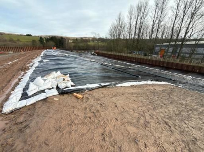 Silt management continues to be undertaken. Additionally, a Visqueen cover (see photo below) has been placed on the south embankment to help reduce the chance of material from the banks washing out into the watercourse.