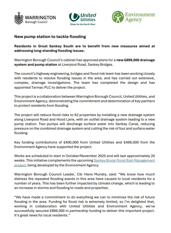 The EA’s partners include Warrington Borough Council (WBC), United Utilities (UU), Regional Flood & Coastal Committee (RFCC) and the Department of Education (DfE).